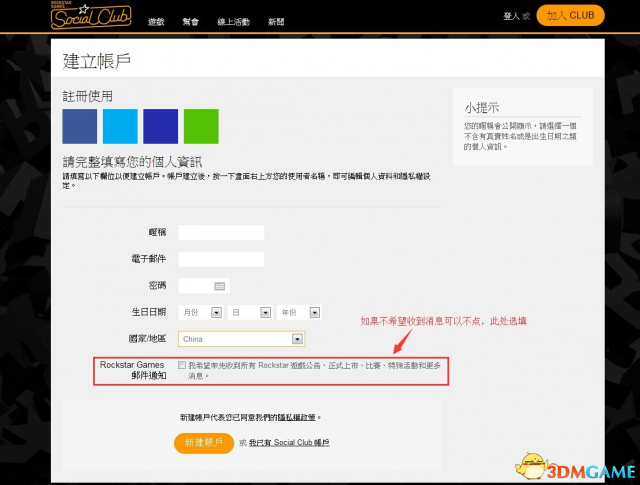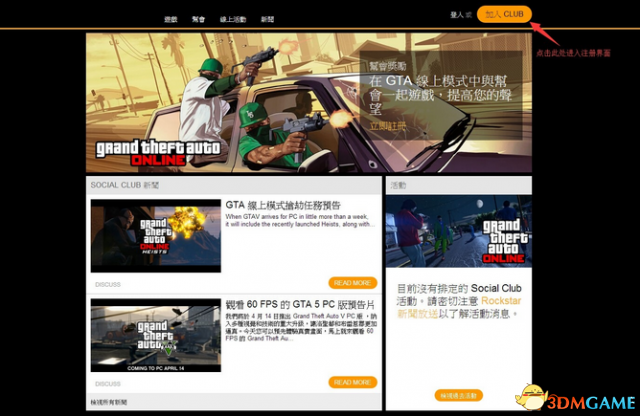 首先是通过上方的链接进入到R星的官网中,该网站是支持繁体中文的,之后我们需要点击右上角的加入CLUB,来进入到帐户建立界面。