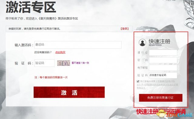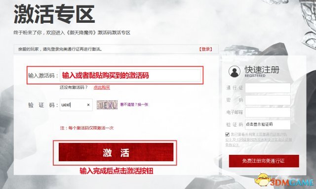 第三步,复制或者输入您在官方天猫商城购买到的激活码,或者官方合作渠道(如PKVS等)购买后获得的激活码,输入到激活专区中的输入激活码位置(如下图红框出),再输入页面的验证码,点击激活即可完成游戏激活。您将可以在正式开服后,进入到御天降魔传游戏中。
