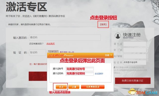 第一步,打开激活页面,您会看到下方的页面。激活的首要前提是需要您有完美通行证,页面中提供了您快速注册的通道。激活页面:点击进入