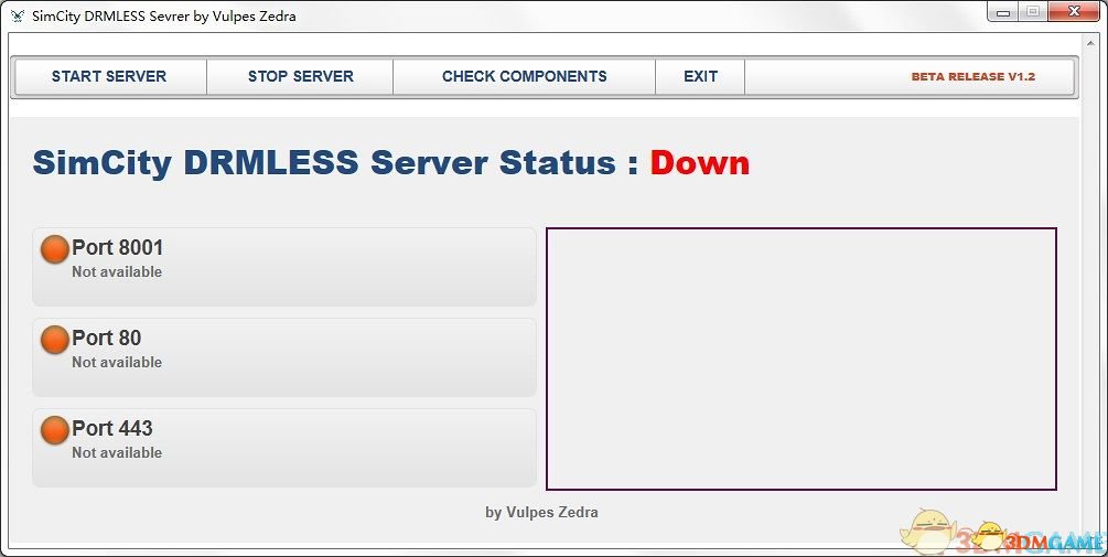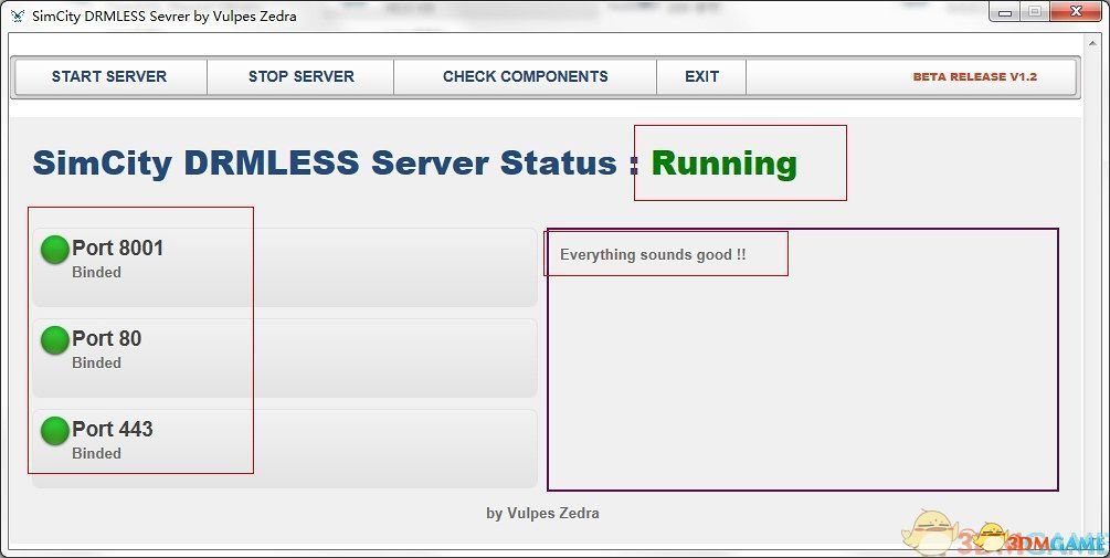 5、双击解压后目录下的Start.exe,出现下图界面后,按一下START SERVER按钮,看到红色的Down变成绿的Running,这个过程中应该会提示你几个程序是否允许通过防火墙,当然要选允许,注意看我红框圈出来的地方是否正常,3个端口和右边的提示。