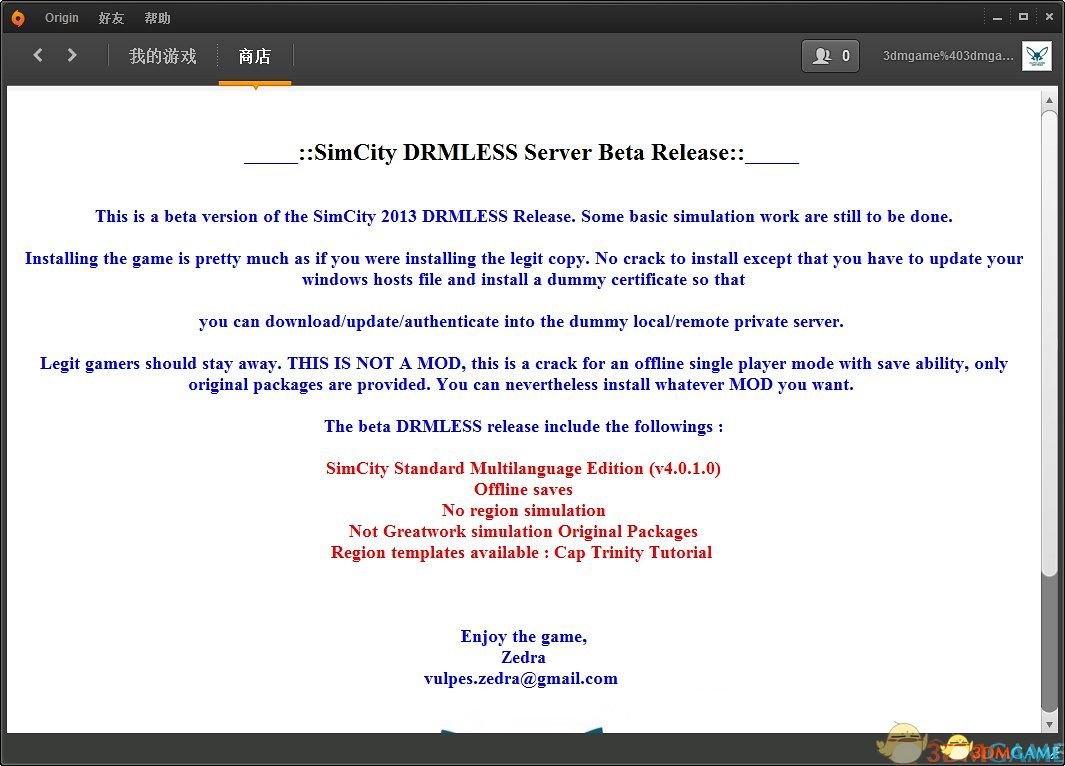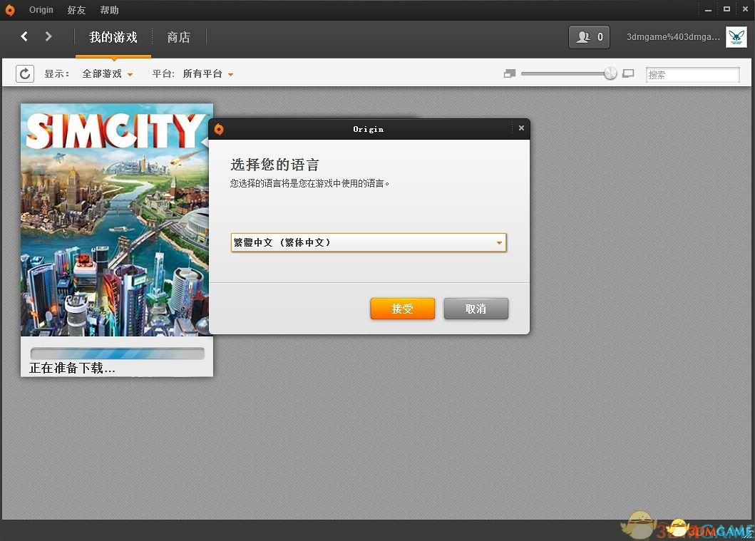 8、如果你以上操作都正确的话,就会到下面这个界面,点商店看到的是一个破解的说明页面,点我的游戏可以看到模拟城市5这个游戏了,然后点游戏封面,再点下载,选择繁体中文,立刻下载,直到下载安装完成,点运行。