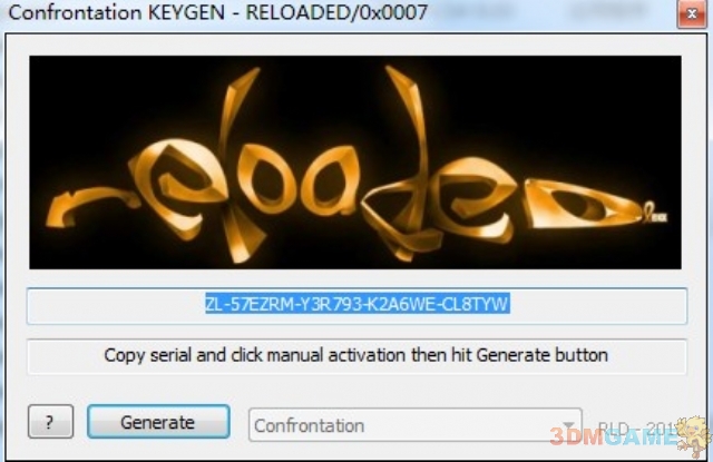 4、切换回到keygen.exe程序,点击Generate,并等一会。然后复制图中蓝色部分。