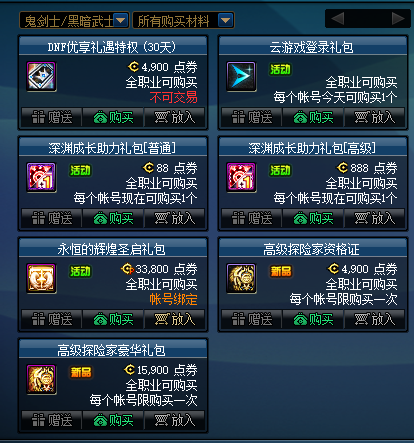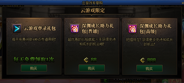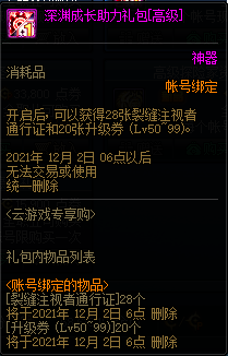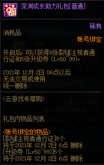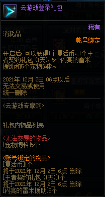 DNF云游戏登录礼包能开出什么 DNF云游戏登录礼包开启后,可以获得1个复活币、1个王者契约礼包(1天)、5个闪亮的雷米援助和5个宠物饲料,其中宠物饲料是无法交易的,其他三个是账号绑定。 详细答案: 似乎有触发条件,可能是云游戏限定。