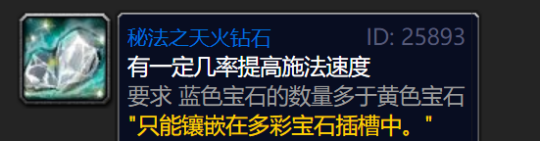 在原始《燃烧的远征》资料片中,法系在最初版本里最好的多彩宝石选择实际上是秘法之天火钻石,这个多彩宝石提供给玩家有一定的几率提高施法速度,但是激活的条件比较苛刻,需要蓝色宝石多于黄色宝石。