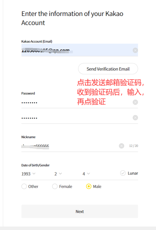 注意:账号格式:小写英文和数字@daum.net,或者注册好的QQ、163、谷歌等邮箱;
