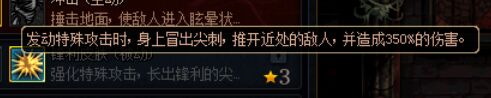 二星级别点出:冲击,主动技能,CD35秒;用力捶击地面,造成485%的伤害,然后强制控制敌人眩晕5秒。