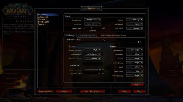 暴雪看起了在怀旧服的图形设置上把大灾变的液体细节和熊猫人之谜的屏幕空间环境光遮蔽(SSAO)都引入了怀旧服,而且我们也可以看到游戏分辨率,有1080P的选项,也证实了怀旧服是用了新引擎重做的,这就比不可描述服要高大上许多了。