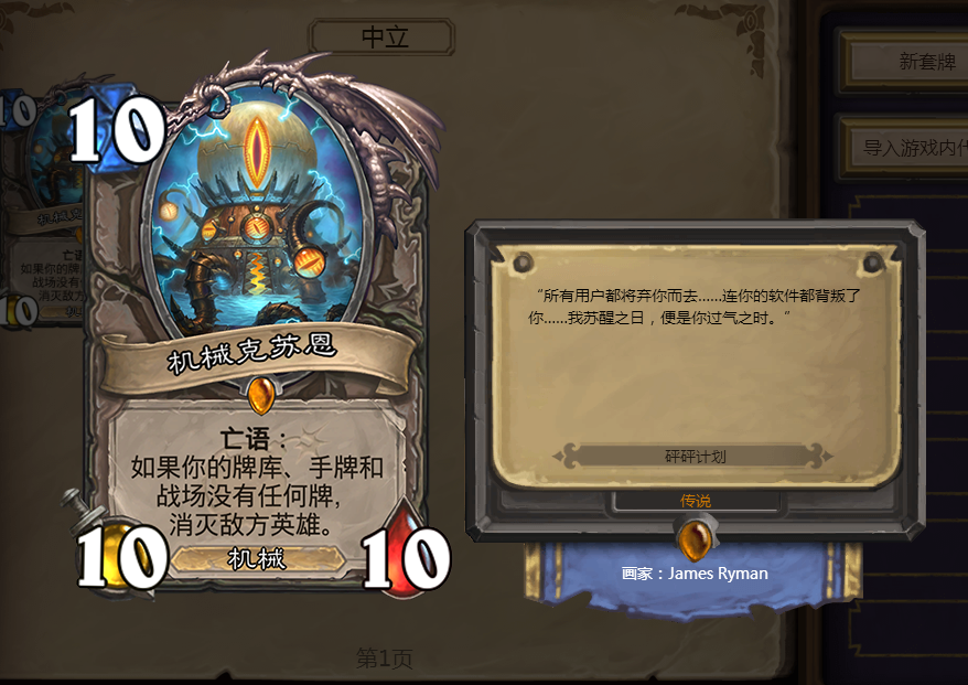 还有在术士崛起有很大作用的克苏恩术卡组,术士自身在解场的能力上面就是非常的恐怖,不论是低费还是高费都能有清场的卡牌。这套克苏恩术卡组就是通过快速过牌掌握场面的节奏从而就刻意很快地占据优势,在娱乐性以及强度方面都是非常的不错,机械克苏恩是这套卡组的核心单卡,在牌库、战场以及手牌都没有任何牌的时候就能直接消灭对手,这样OTK效果能够直接让对面感受到绝望,前期具有快速过牌的能力,到后期触发机械克苏恩的亡语游戏就结束。